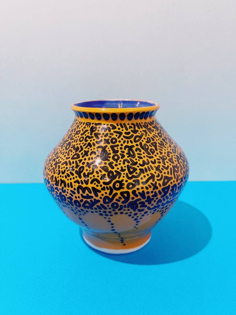 All of my ceramics are a collaborative project with my mother, Angela, who is a ceramicist. She creates all the vessels and I hand glaze them. Then they are fired in our own kiln to the exact temperature necessary. When it comes to my mark making technique, I like to say it's my "brush stroke" (Some...