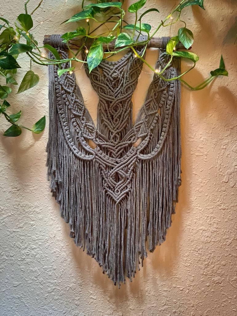 Taupe Macrame wall hanging was originally made in 2020 from recycled cotton cord and wood from the Catalina Mountains just outside of Tucson, Arizona. This wall hanging was originally done in "taupe" color, but can be created to order in any color.