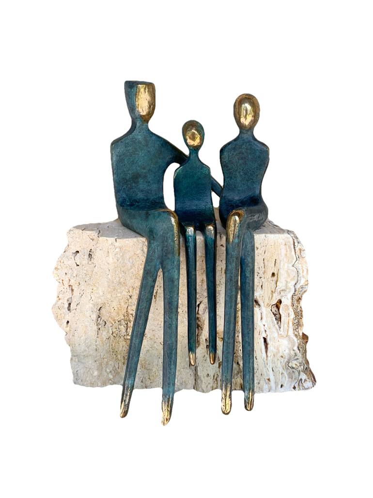 A bronze family portrait. The teal patina is unusual and it looks interesting as the surface is slightly textured. The faces, knees and feet (they don't really have feet ;-))are golden polished as it presents highlights to the sculpture. The travertine base is hand selected from the quarry in N...