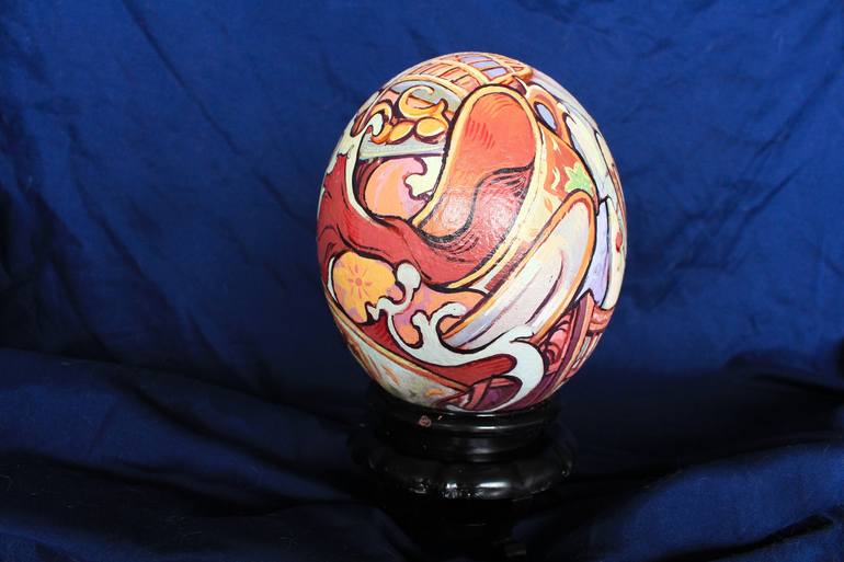 An ostrich egg evoking the lighthearted mood of tea party. The frills of the tablemats and outfits, and the gold accents of the tea set bring an extra brightness to the theme. The egg is coated in polyurethane to protect the design and colors.