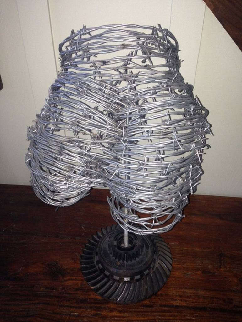 A barbed wire sculpture shaped like a nice derrière. The measurements are 17" total height including the base which is 15" wide, and 9" deep.