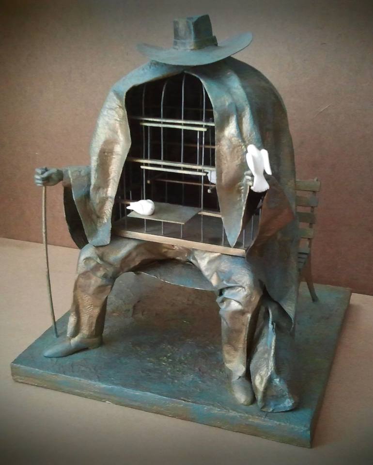 2006. "Therapist II" - Assemblage of paper mache, plaster, iron wire, wine cork, wood, all carved or modelled on cardboard. Made in a different pose from the original work of Magritte, as if to grasp an imaginary movement, it represents my tribute to the genius of the great Belgian master. Certif...