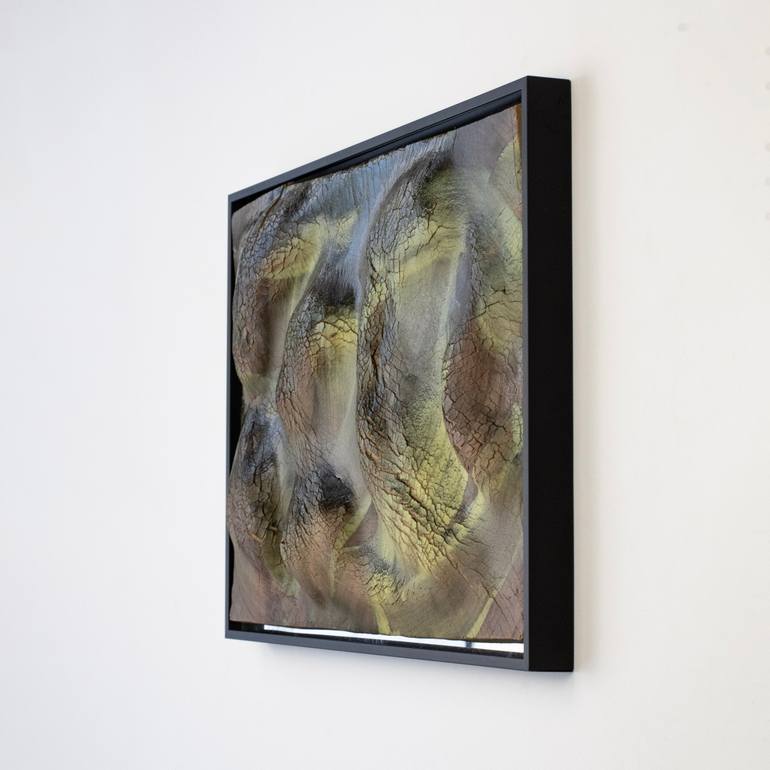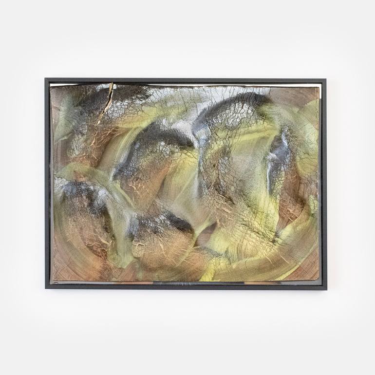 Artwork dimensions: 23 x 32 x 4 cm. Dimensions including the frame: 25 x 33.5 x 5 cm. “Terra Cognita. Desert Green” is crafted from khaki stoneware brushed with varying shades of green engobes. Its cracked, fluid-like surface evokes dried algae on a sandy sea floor. High-fired at 1250°C, it is ful...