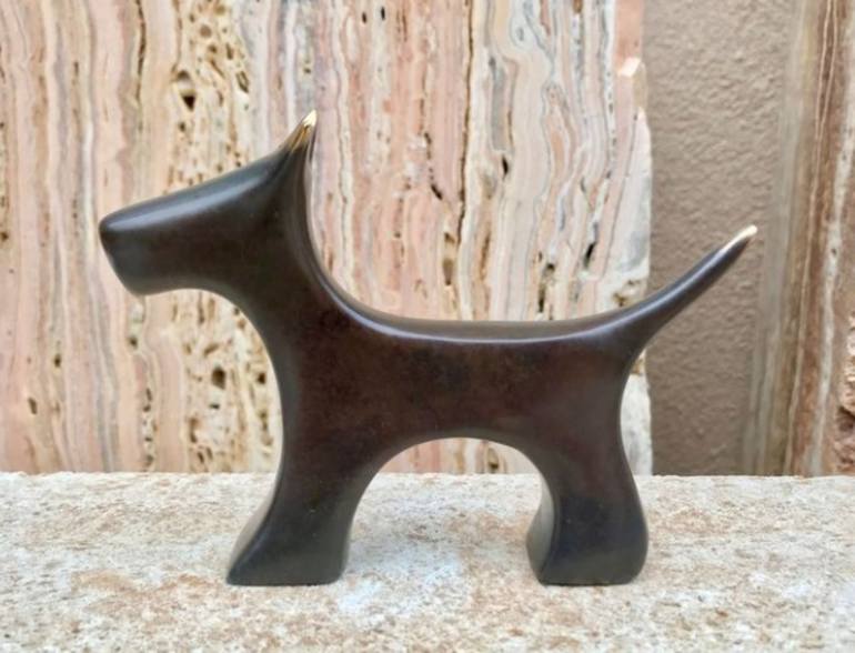 This is my dark brown larger dog (smaller puppy dog is 3.5") It is 4.75 " across and weighs 1.5 pounds. The metal work is meticulously executed and the ears and tail are highlighted and polished. The surface is waxed to prevent rapid tarnishing. Occasional polishing is recommended. A felt surface pr...