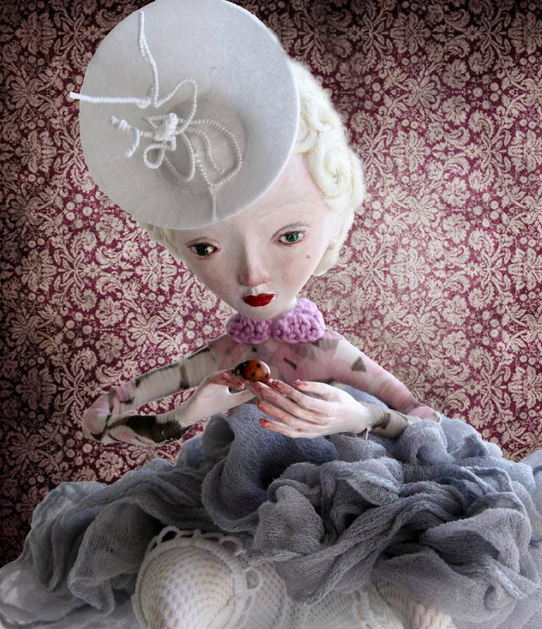 The Art doll Gisele is handmade and she has a Certificate of Authenticity. She is 20.5cm. height in sitting position. The doll was sculpted from air dry clays on a metal armature, painted with acrylic paint and finished with mat varnish. The hairs are natural wool. Retro hairstyle, modern hat and re...