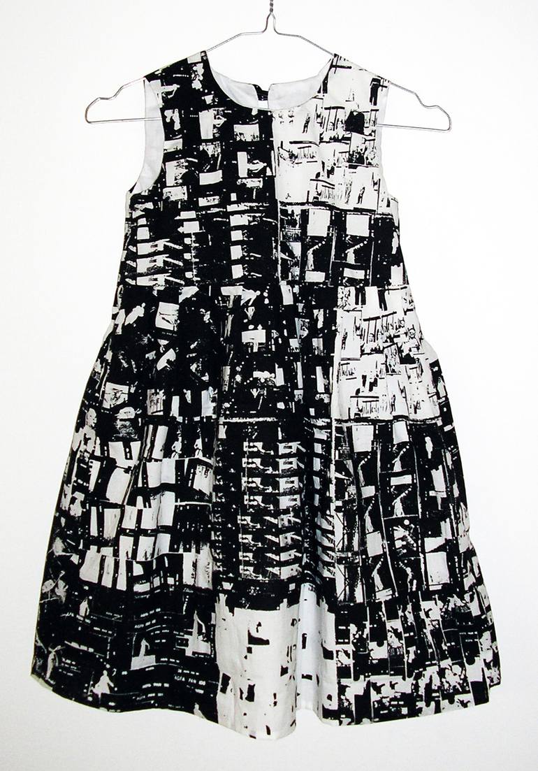 WORLD of FASHION Mixed Media: Textile sculpture / dress Technique: (fashion show)photography, collage of "Kontaktabzügen /contact sheets", (flat) screen printing on cotton