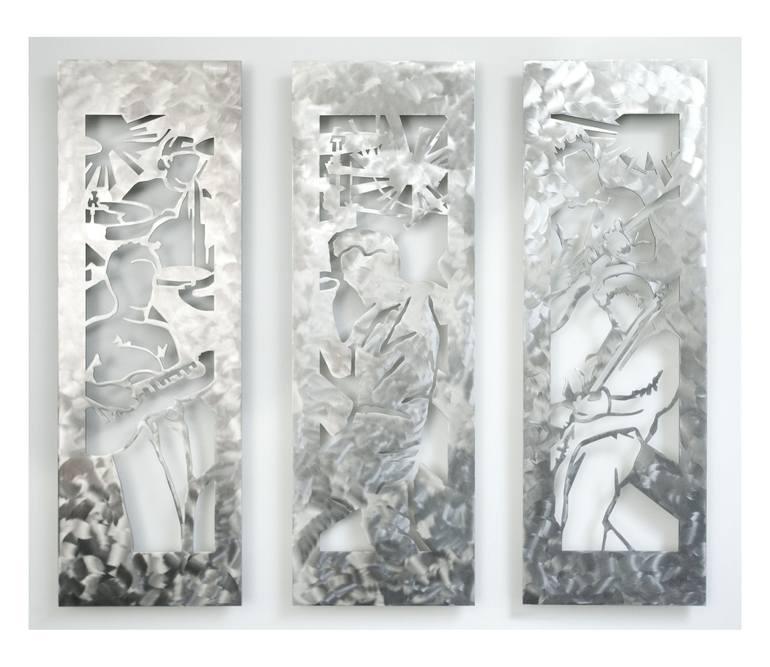 The energy of a rock band in concert. Laser cut stainless steel combines line, drawing and sculpture. Floated off the wall, shadows add a changing layer and the hand brushed surface is lustrous and softly reflects the light around it. The stainless steel is 3/16" thick. Mounting plates are provi...