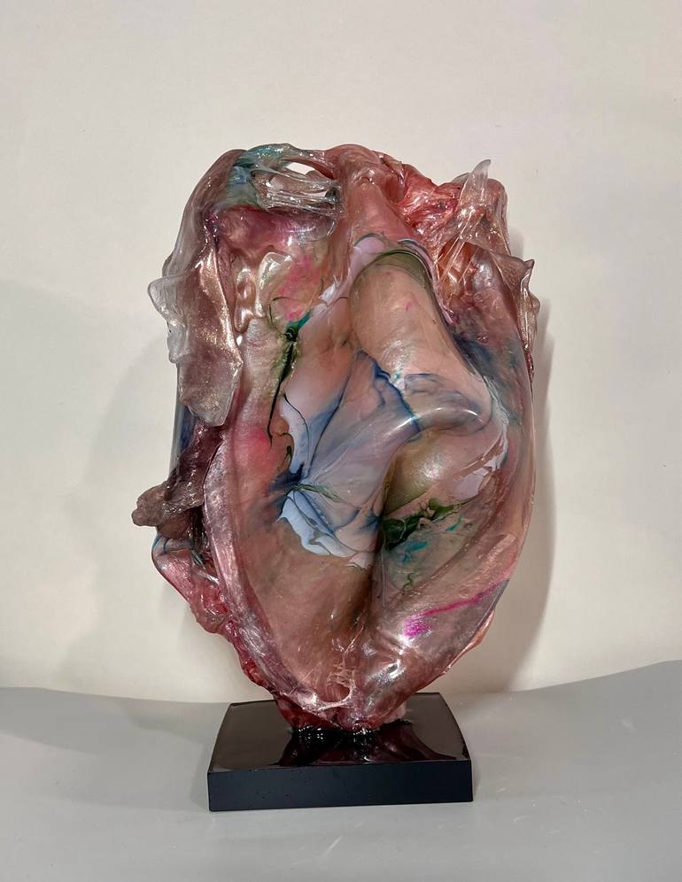 "The Beauty Within" is a mesmerizing resin sculpture that blends organic and abstract forms, resembling a deconstructed human heart or torso. Its translucent layers, marbled with soft pinks, blues, and greens, create a fluid, ethereal effect. The contrast between smooth curves and jagged edges symbo...