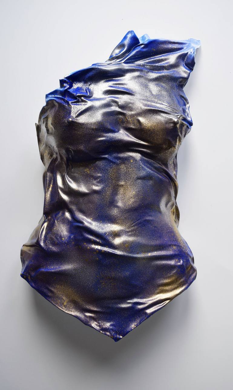 From my series of Wet. A wall sculpture representing a Blue Corset. Corset; Gold / Blue / Silver ready to hang on your wall. The sculpture will be hanging on a transparent silicone thread. Fed up with flat shapes and paintings? This is a 3 Dimensional Sculpture with a Wow factor for Office or Hom...