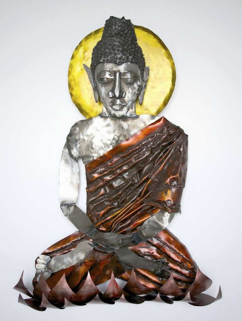 Gautama Buddha also known as Siddhartha, the fully enlightened awakened One, sits in meditation on a lotus. I hope this sculpture brings you into deep contemplation and peace. Wall hanging sculpture measuring 3 feet 8 inches tall by 2 feet 8 inches wide by 7 inches deep. Made from welded sheet st...