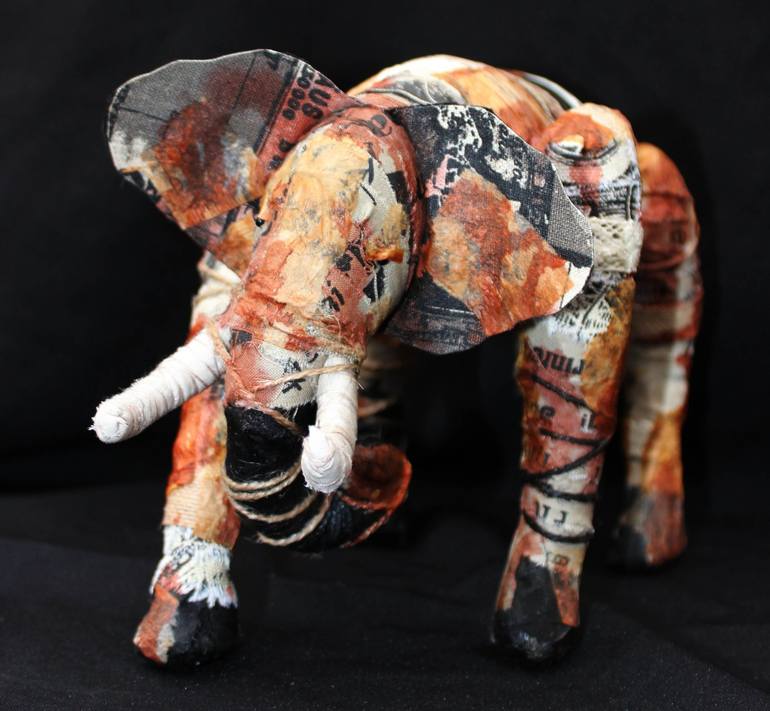 The Giant Walk is made with designer printed linen and cotton fabrics. I use several collage and paint techniques on the sculpture before it is dipped in a medium to harden the fabric and seal it. When elephants walk they sometimes swing their heads and tusks from side to side.