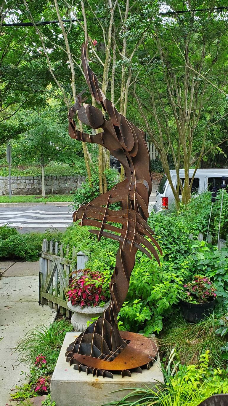 contemporary goddess, empowerment, corten steel, outdoor sculpture, garden sculpture, dancer, rhythm and movement