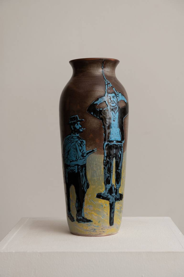 This ceramic vase was inspired by the movie The Good, the Bad and the Ugly. I am a big fan of Sergio Leone and his western movies. This is one scene from a movie. The style of drawing/painting on vase is realistic, with specific colour which is more similar to comic style.