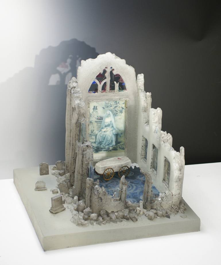 Cast and carved glass. In a moment of reflection, a nun looks upon a glass coffin containing a shadowy figure. She is surrounded by windows depicting images of past relationships and decision points in her life.