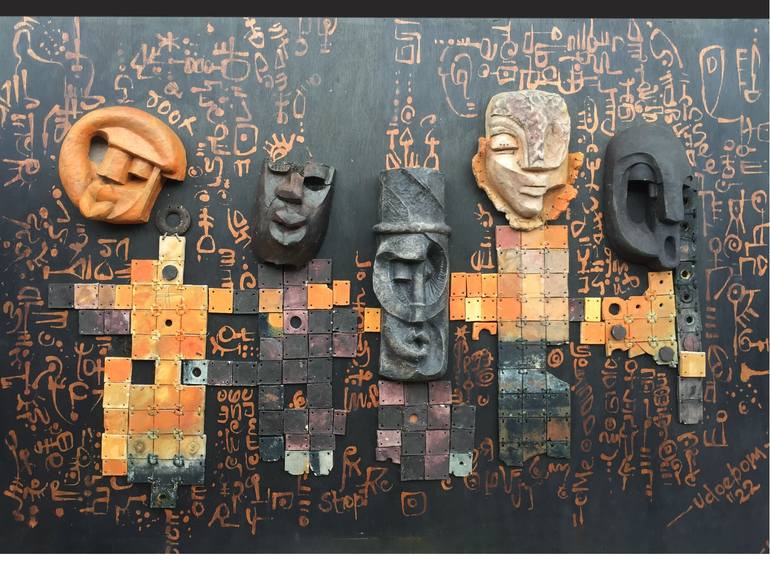 There is need for new values, questions, inspirations and approaches to problem solving. The question is; how can we appraise TODAY while projecting the FUTURE without giving credence to the PAST? These patinated Ceramics Pieces is a composition of African Mask Forms linked with small square slaps ...