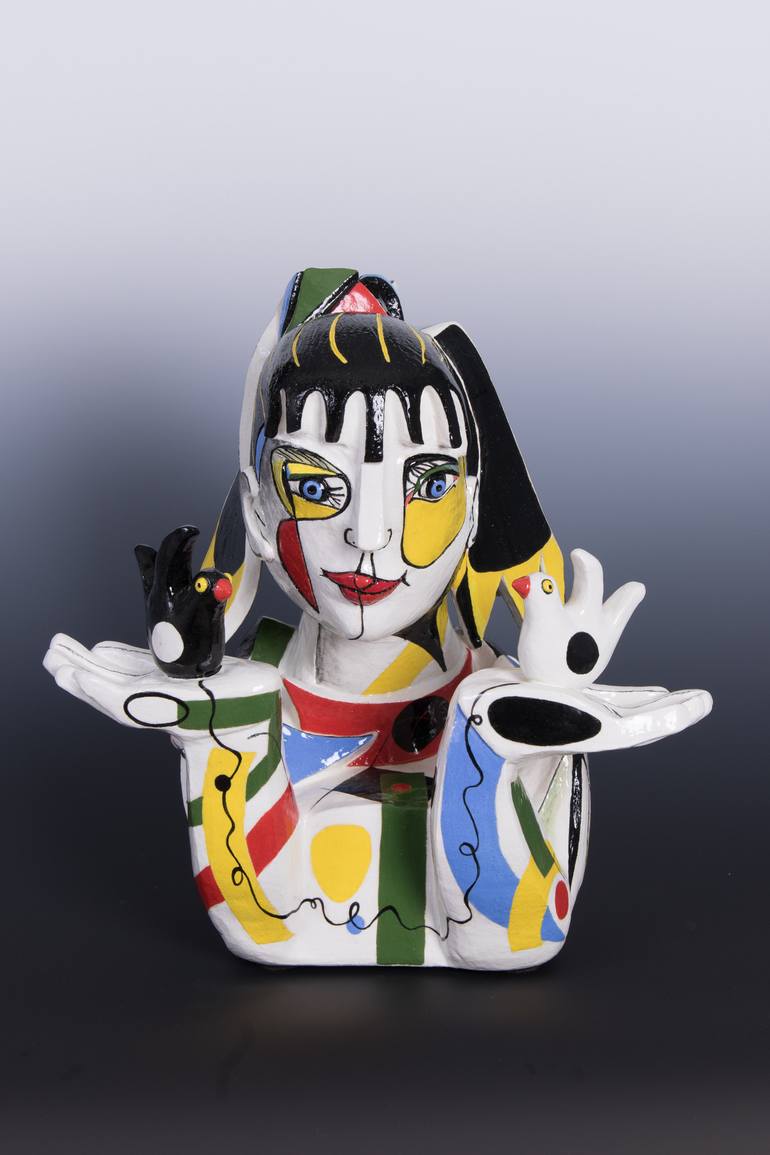 Ceramic sculpture representing the personality of the perfectionist. She balances the scales of justice with the birds in each hand.