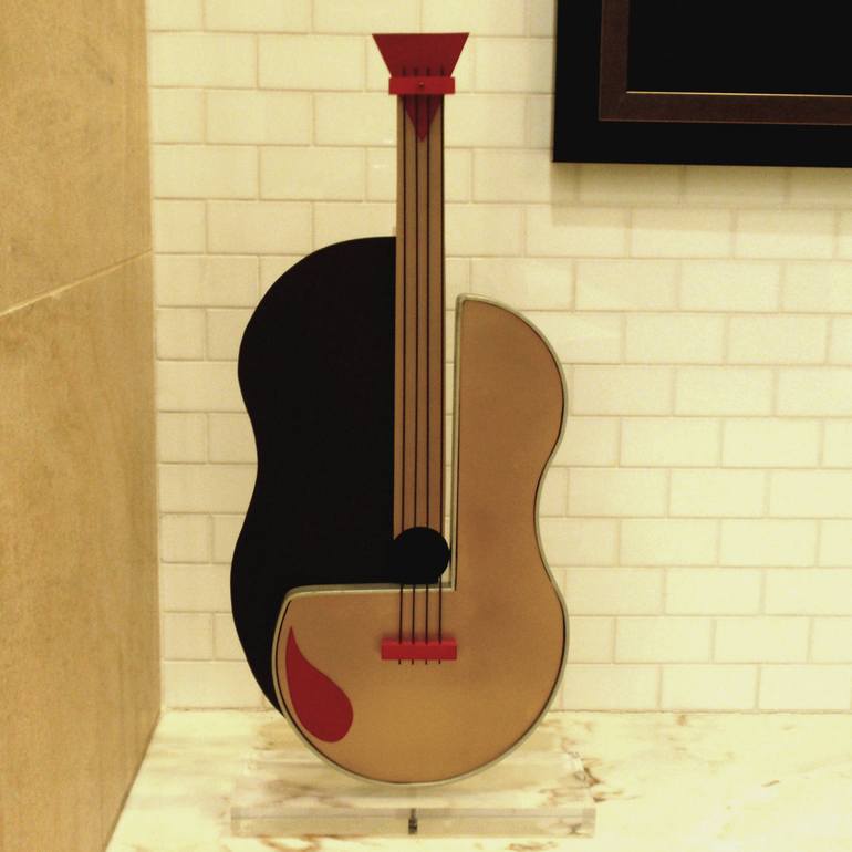 This artwork is nspired by Picasso's guitar cardboard assemblages created in 1910-1912. The central portion of the guitar is framed in bent anodized aluminum strip. The flat surfaces of the piece are composed of painted plexiglass, while the "strings" are thin carbon composite rods.