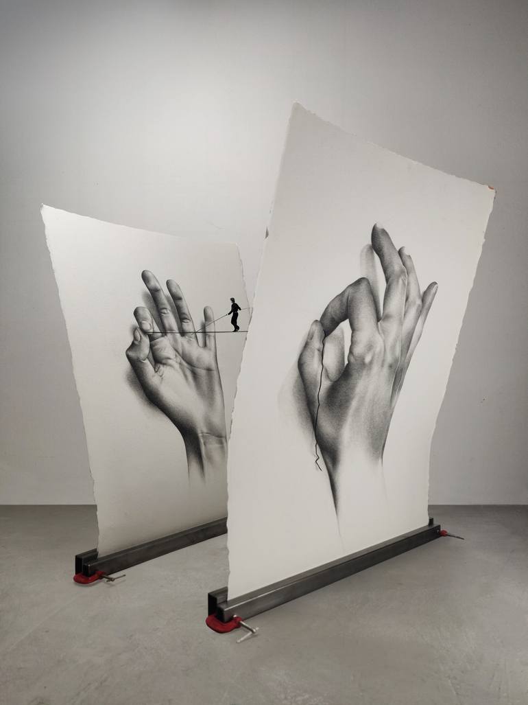 The Tightrope Walker is a work realized in 2019 and the first of the series related to the theme of realm and representation. This work is composed by mixed elements: - two sheets of Arches paper 100% pure cotton, 640 gsm - iron bars that support the structure - four clamps that hold the bars toge...