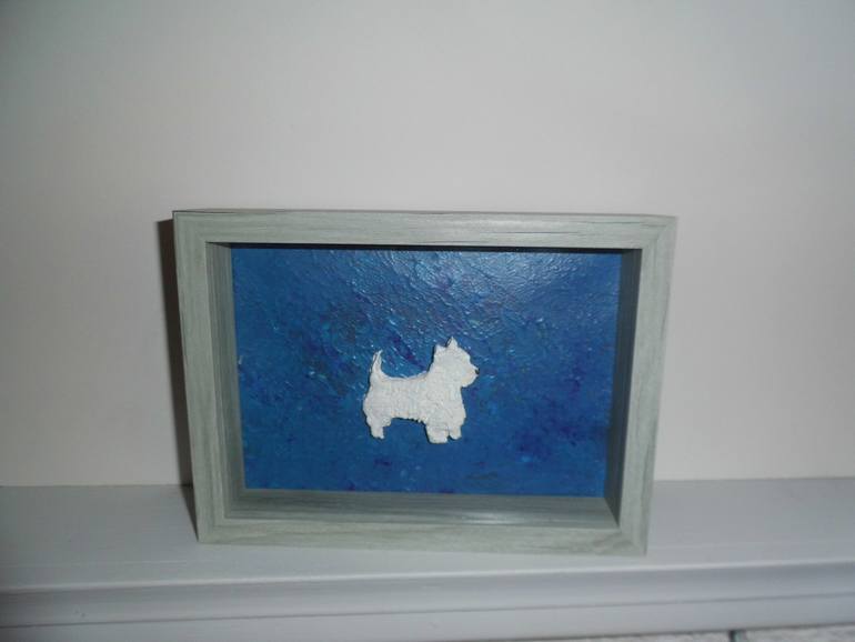 The West Highland Terrier commonly known as the "Westie" in a 5 x 7" Grey Shadow Box. Shadow Box is 1.5 in width. The West Highland Terrier is clay sculpted and painted white. The Westie is attached to an abstract painting done on a Strathmore Card. The painting and sculpture is enclosed by glass. T...