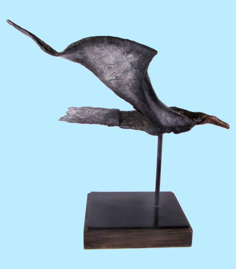 This yellow-nosed albatross is part of The Menagerie - a series of unique, one-of-a-kind animals and creatures sculpted out of wood, bronze, other metals and epoxy clay. The albatross' body is a found piece of burnt wood and the wing and tail have been cast in bronze.