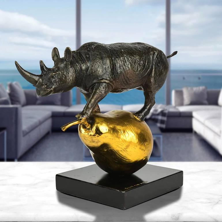 This authentic bronze sculpture titled 'The rhino was just pearfect' by artists Gillie and Marc has been meticulously crafted in bronze with gold patina . This sculpture features a rhino standing on a pear and comes in a limited-edition series of only 40. Across different cultures, the pear repres...