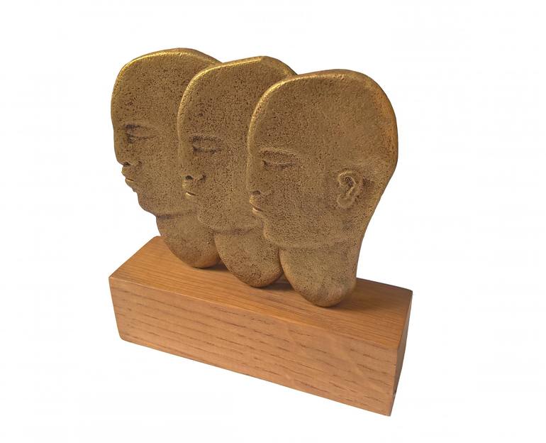 Three heads in pressed brass mounted on a wooden base. A beautiful sculpture ideal for an office or any other interior.