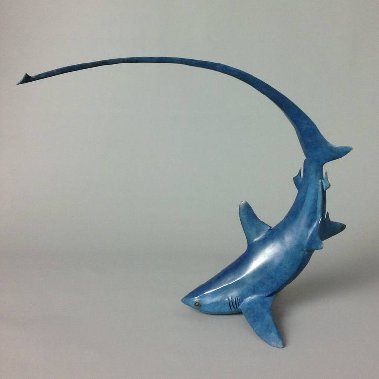 This work is inspired by the movement of the Thresher Shark poised in the action from which this shark derives it's name. The tail curving over it's head creates graceful arc. I work in bronze to give my work a permanence and seek to capture the movement of the wildlife I depict.