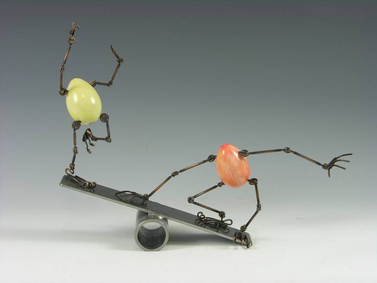 Tomoaki’s earliest works focused on abstract concepts in jewelry design and expressive figural forms which both stayed at the vanguard of his works until he began constructing anamorphic creations around the year 2005 through his Yolk Art bronze series. As Orikasa became more comfortable blurring the lines between reality and his artistic vision he started to create studies in narrative work. Living between spoken languages brought body language to the forefront of Tomoaki’s narrative anamorphs and eventually led to the first of the artist’s Eggtion Figures being created in early 2016. Over the year that followed Orikasa perfected the production and assembly of small parts that allow him to articulate his works into emotional fluency. The moments his sculptures capture portray simple, relevant human experiences that are commonplace.