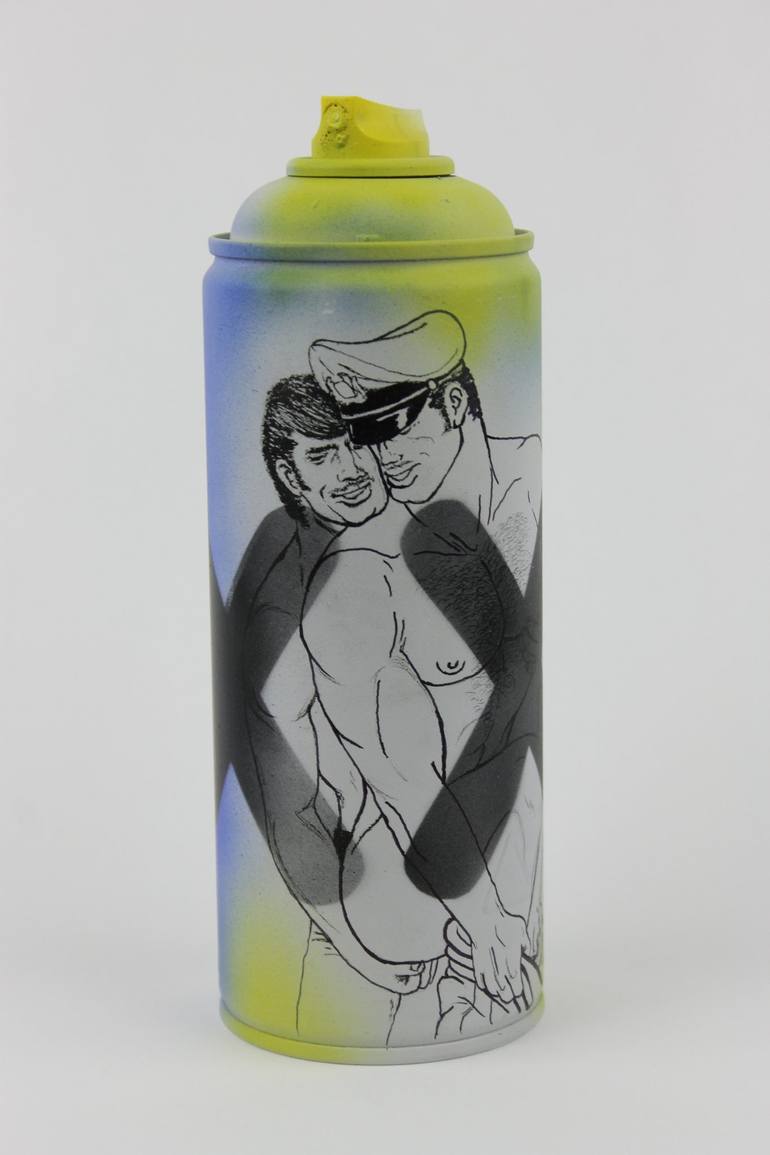 One of kind up-cycled spray paint can with Tom of Finland figures made for the celebration of Tom's 100th Birthday.