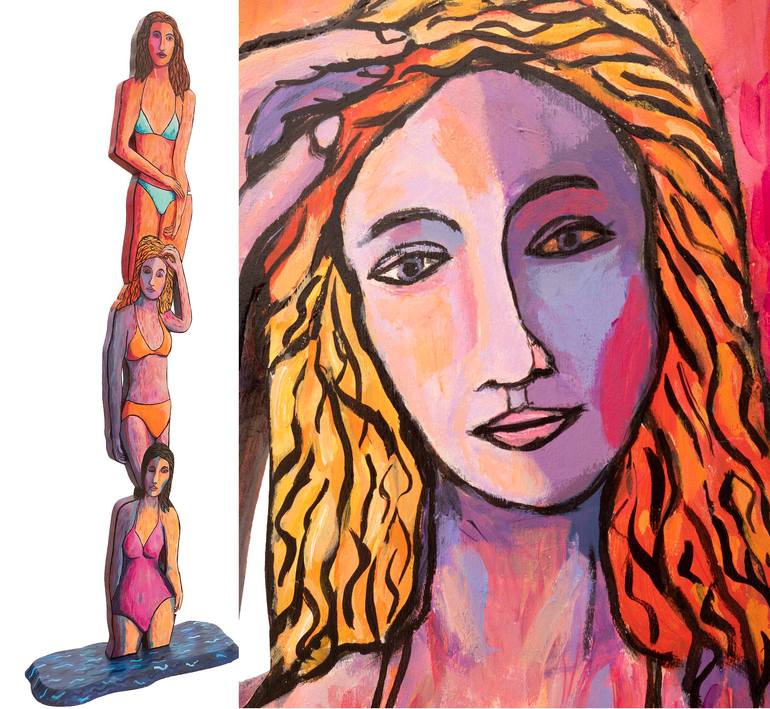 I am lucky to have spent many days from my childhood to the present on Southern California beaches. They inspired me to create colorful, expressionistic figures from the iconographic images of beach going women and men, from surfers to sunbathers. I chose as the form for these works, the totem poles...