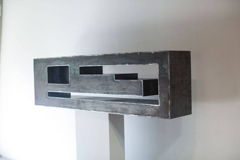 Part of the industrial series of solid-seeming steel constructs with acid wash patina with protective coating.