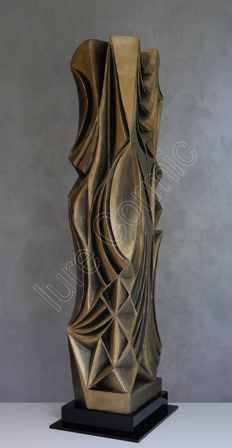 unique piece, resin sculpture, each side has a different design. material and painting with metallic colors makes sculpture like bronze or other metal, but the material of the sculpture is light and allows you to have at home an affordable sculpture. it can also be placed outside. it has been recent...