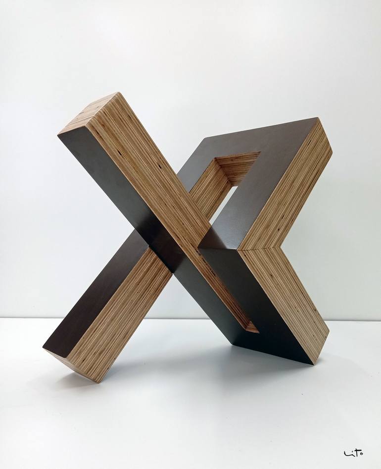 Piece of the Trazos series. Sculpture made of wood, finished in iron cold patina oxide. The work is developed following a constant section that explore the geometric relationship between planes that move in the three axes of space.