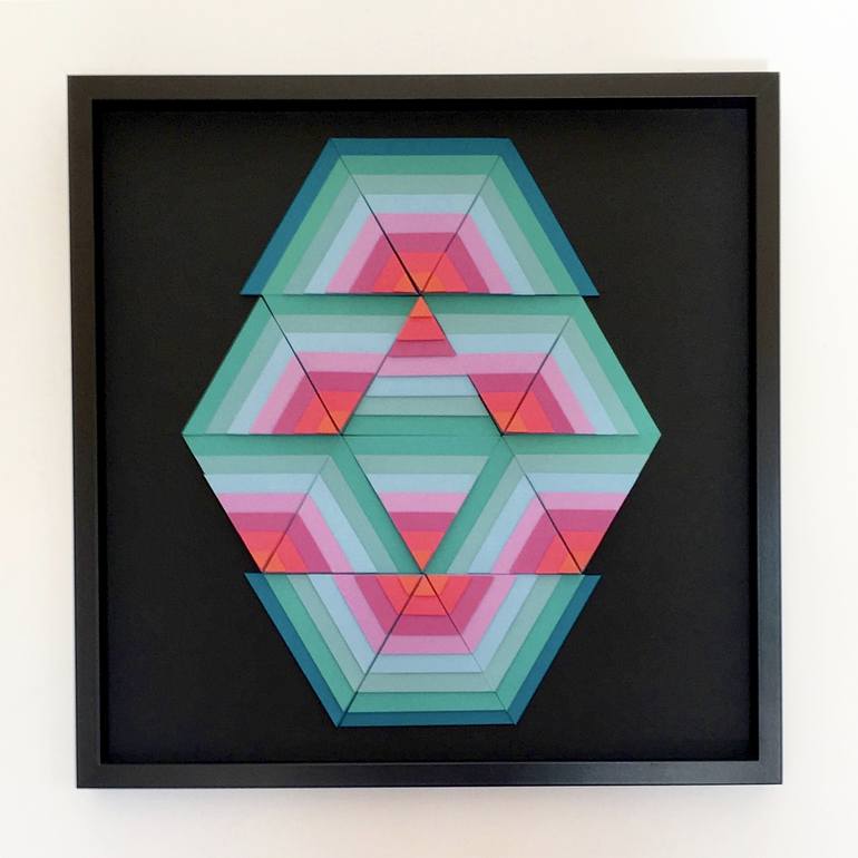 Playing with cut paper to create geometric forms is what I love to do! This piece was inspired by aztec designs but also has a hint of art deco in there too. The 3 dimensional form is made by cutting and layering paper and building depth with spacers between each layer. Sealed into a black wood bo...