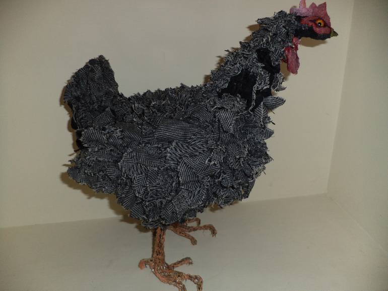 Life size hen sculpture, indoors or weatherproof outdoors. Unique mottled feather effect created by use of hand shaped fabric and wire. The subjects individual character is represented by making use of some recycled materials that are moulded by hand over many hours giving an unusual slant on their...