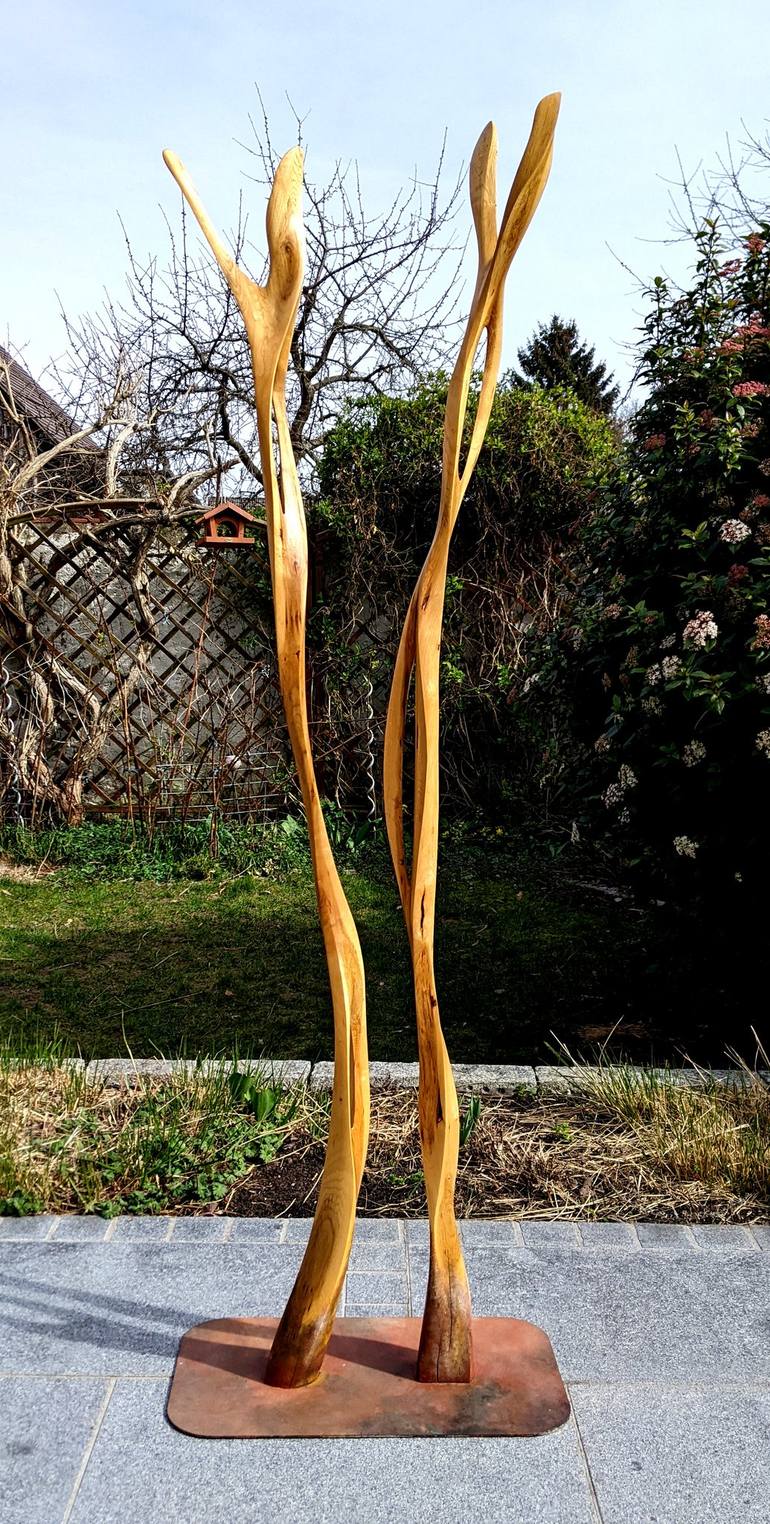 Two Gazelles in Oak Oak on painted Metal Important: my sculptures are for inside placement only For more details see video at https://www.youtube.com/shorts/B7t21ehARNo