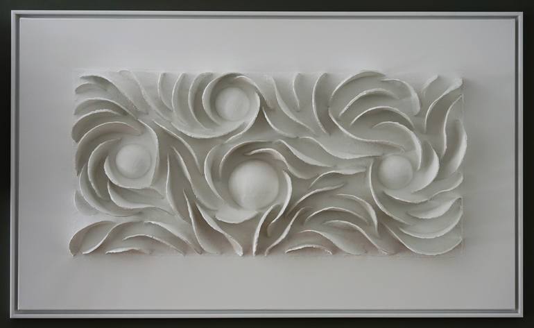 White relief, painted paper mache on a plain canvas base, captured in a ton-sur-ton wooden frame. This work is inspired by time. I see an impression of a flow pattern, carved out of rock by millions of years of erosion. Motion frozen in time. A reminder that even the simplest rock is the result of ...