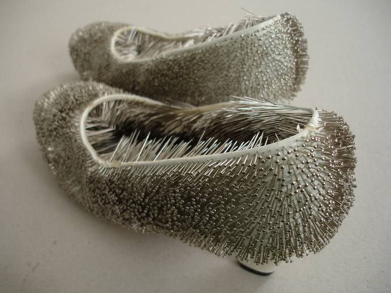 Erwina Ziomkowska received a master's degree in painting from Academy of Fine Arts in Katowice, Poland. "I create objects and temporary installations. Women`s garments and several pairs of shoes all pinched with a huge amount of pins, skulls so fragile that with every touch they may break, swing with additional ballast, paper punctured with a pin/knife, neons, some books, this is all what I need to create my works. Very characteristic is the extremely minimalist way of acting, boiled down the simple, by design, repetitive activities i.e.: grooving, threading, puncturing, scratching, etc. Despite the extreme intensity of work it is very difficult to notice in the completed objects, even a shadow of the passing expression, which is now replaced with entirely purified forms, reminding us more of a picture of sterile cool beauty than a record of human feelings and emotions."