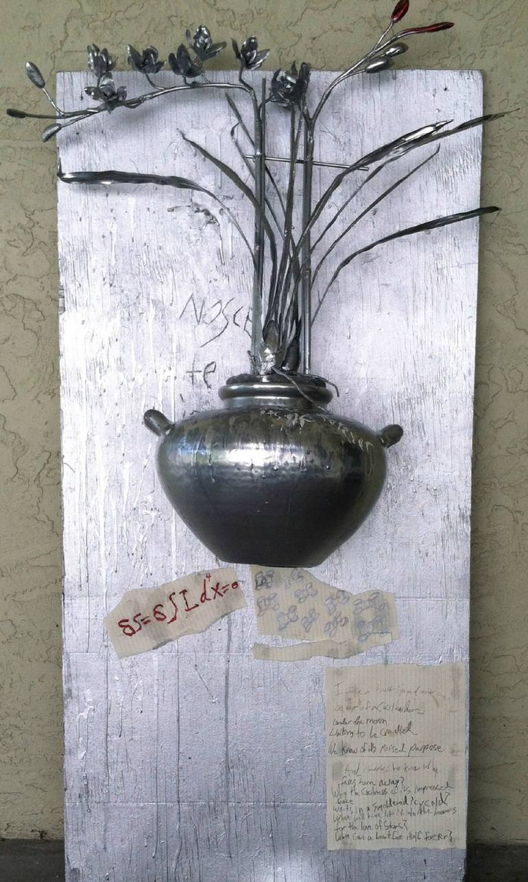 household; oil; spray paint; paper; pencil; wood; ceramic poem: I see a heart spread out on top of a cool boulder under the moon waiting to be cradled. We know of its poised purpose. And it asks to know why faces turn away? Why the coolness of its impressed face waits in a smoldered icy cold? Wh...