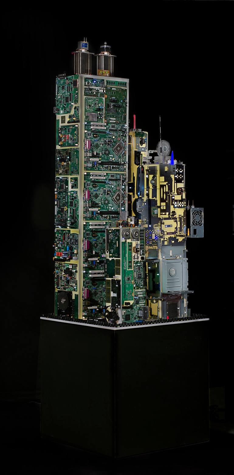 "Urban Series is a recreation of commanding skyscrapers based on imaginary cities. The buildings are constructed with collected computer discarded fragments as old potent icons of modernity in the decline of power and technology" Each Piece is mounted in a back-lit plexiglass base..