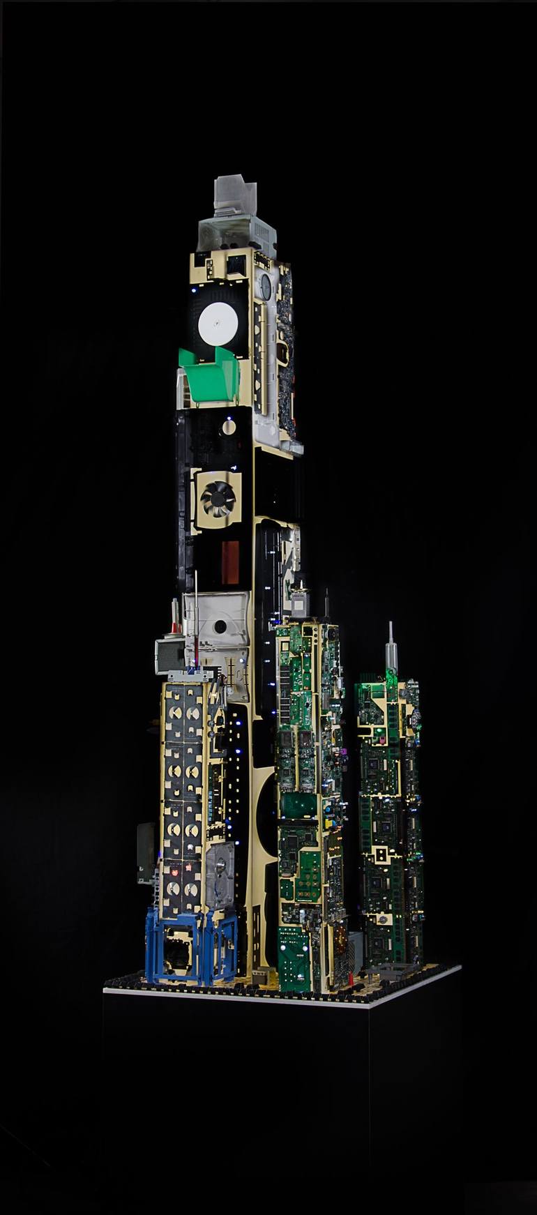 “Urban Series is a recreation of skyscrapers based on imaginary cities.The buildings are constructed with collected computer discarded fragments as old potent icons of modernity in the decline of power and technology.” Each piece is mounted in a back-lit Plexiglas base.
