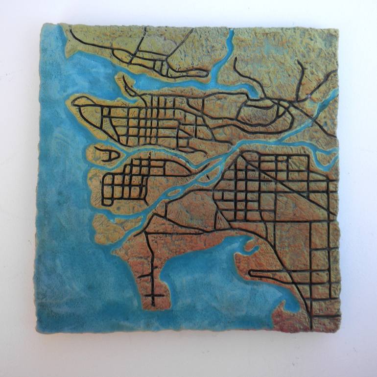 Urban Tablets are a series of uniquely textured, carved, and glazed ceramic maps depicting various cities. Approximately 9 pounds in weight and 13.5” x 13.5” x 1” in size, the tablets come ready to hang. Standard picture hanging hooks are recommended. Some tablets have been cut into quarters and mo...