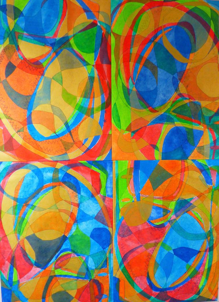 Inspired by Matisse cutout exhibition I wanted to create paintings from paper. Multilayered processes including mono print, stitch and painting are used to create kaleidoscopic panels on paper that are then attached to canvas and stitched together before being stretched