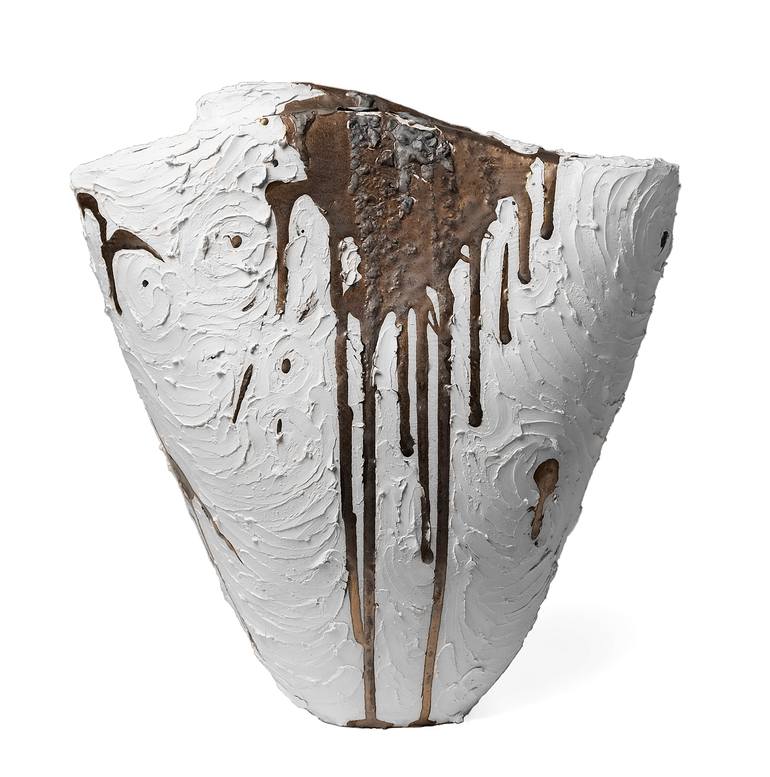 This one-of-a-kind sculptural vessel from Beverly Morrison’s White & Gold Collection captures a moment of expressive force—an eruption of energy frozen in clay and glaze. Bold yet balanced, its textured white surface is built through rhythmic, meditative hand movements that trace the artist’s in...