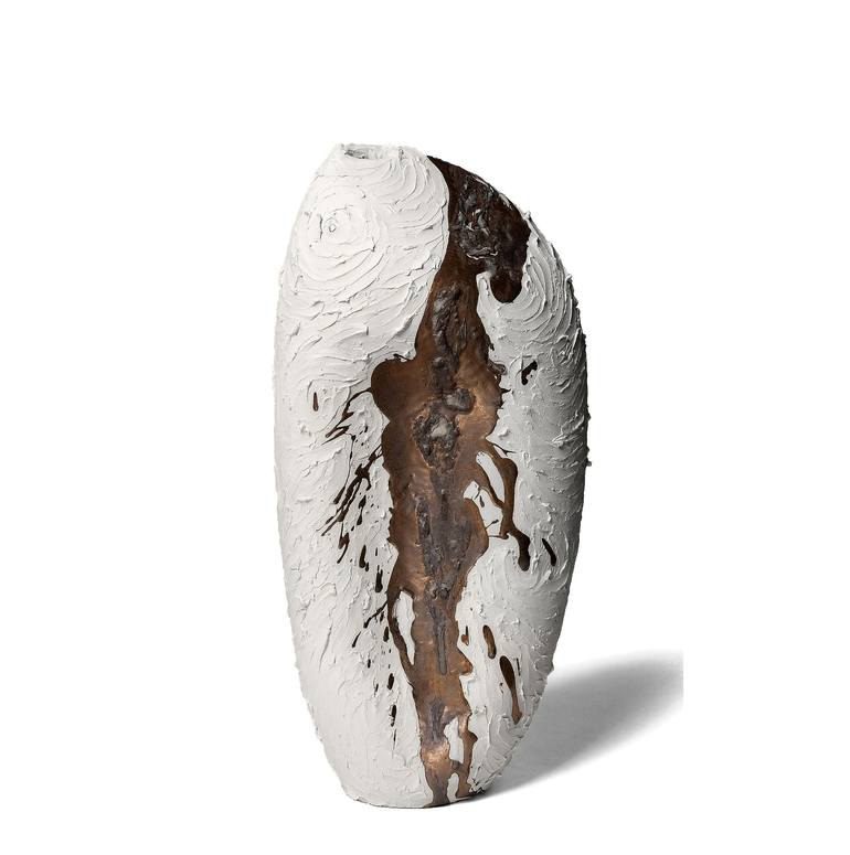 This sculptural vessel from the White & Gold Collection embodies a striking duality—earth and alchemy, rawness and refinement. A river of metallic gold seems to press up from within the form, dark at the core and warming as it spreads across the textured white surface. The surrounding ridges of clay...