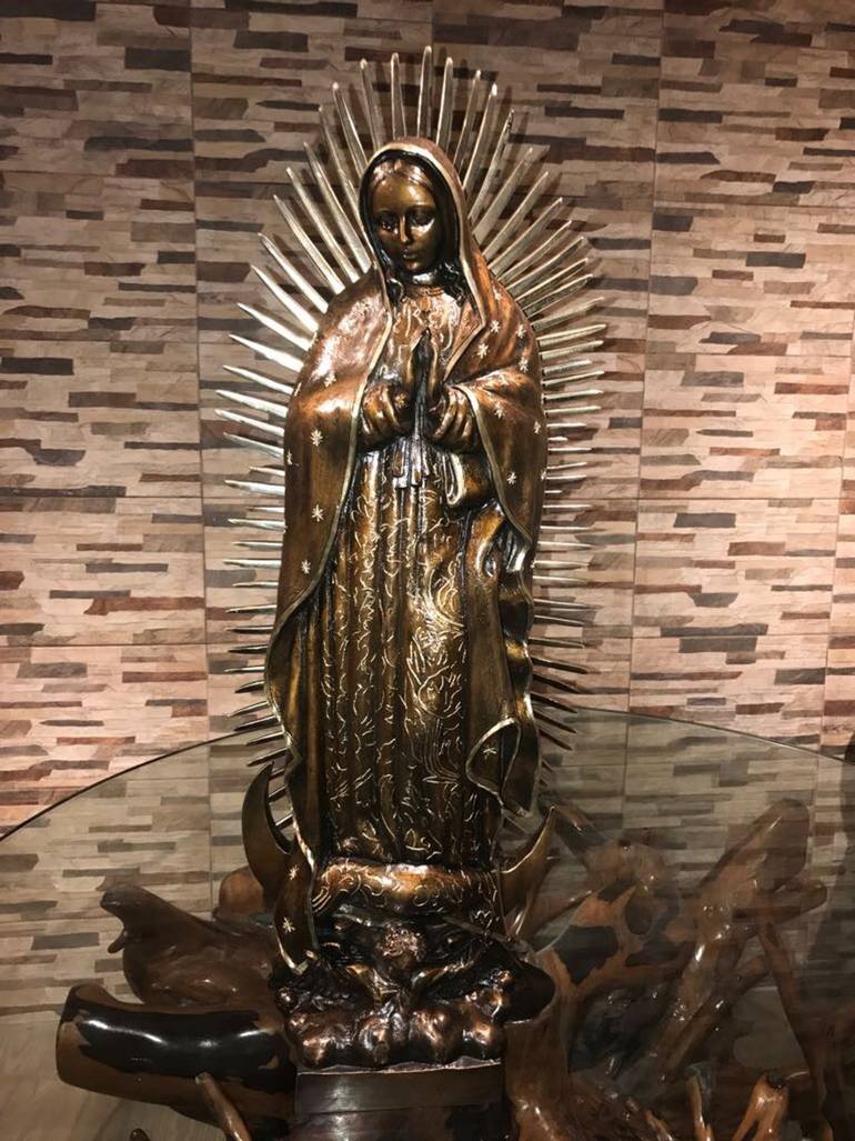 SCULPTURE MADE IN BRONZE OF THE VIRGIN OF GUADALUPE, REPLICATES THE WORK WE DID FOR THE BASILICA DE LOURDES FRANCE IN BRONZE WITH PRECIOUS STONES IN THE YEAR OF 1959