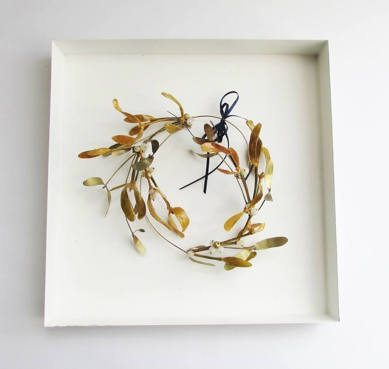 Viscum album - Mistletoe, symbol of luck and romance. This wreath is made of preserved mistletoe, brass and snow jade. The mistletoe is specifically preserved and coated with specialist resins with fibre glass. The blue ribbon is linked with the Virgin Mary's Marian blue associated with holiness an...