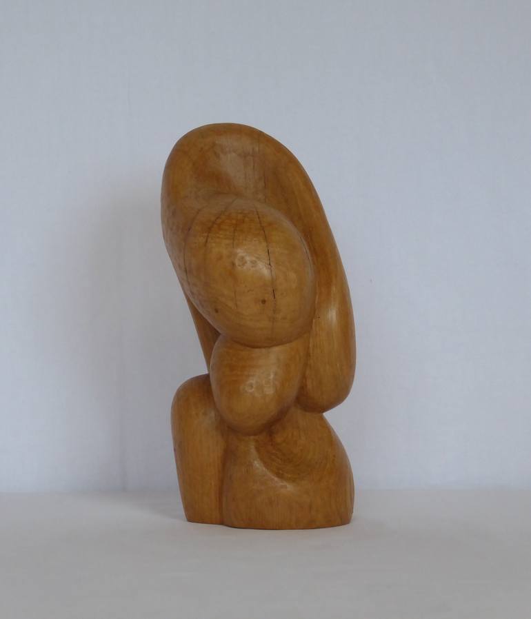 "Viso" is an early, abstract sculpture, a testament to the artist's exploration of form and material. Carved from oak wood, this sculpture embodies the essence of its Italian namesake, "face." The artist has treated this piece with a traditional beeswax and turpentine mixture, then polished it to e...