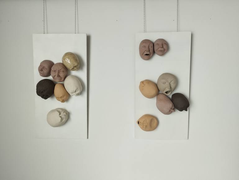 "Viva" is a captivating wall installation, a part of the "Eyes - Nose - Mouth" series. Crafted from ceramic, stoneware, and faiança, this medium-sized sculpture captures the essence of human expression through the simplification of the face. Mounting hardware is included for easy display. The artis...