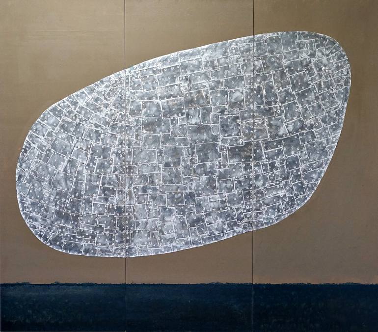 Eighth work in the series. This is the largest work in the series and is made up of three panels, one consecutive to the other. In this work the artist wanted to represent the unconscious (always in the form of a large rock suspended in the air) in a more "bulky" way but at the same time light, susp...